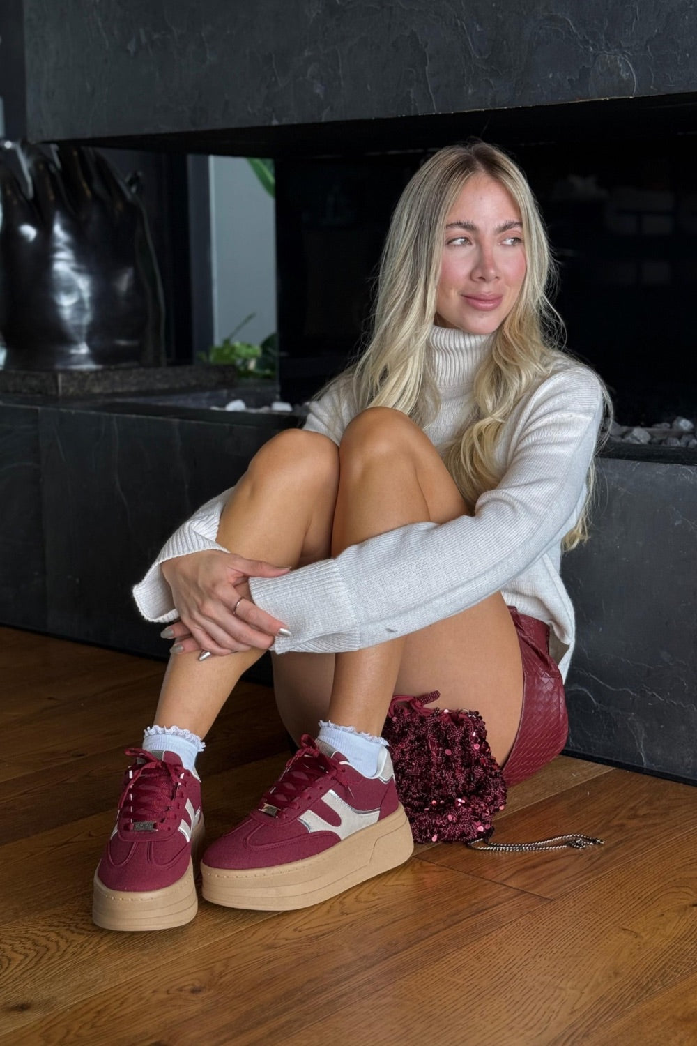 ¡Descubre lo último en estilo con nuestras Gema Vinotinto. Estas elegantes zapatillas cuentan con un tono Vinotinto en gamuza de alta calidad, detalles en piel artificial beige y plateado. Además, su suela de goma color caqui te brinda comodidad y un aumento de 5.5 cm en tu estatura. ¡Haz una declaración de moda con Gema Vinotinto.