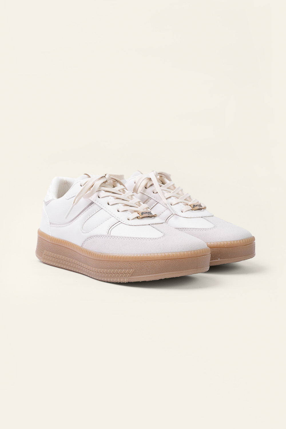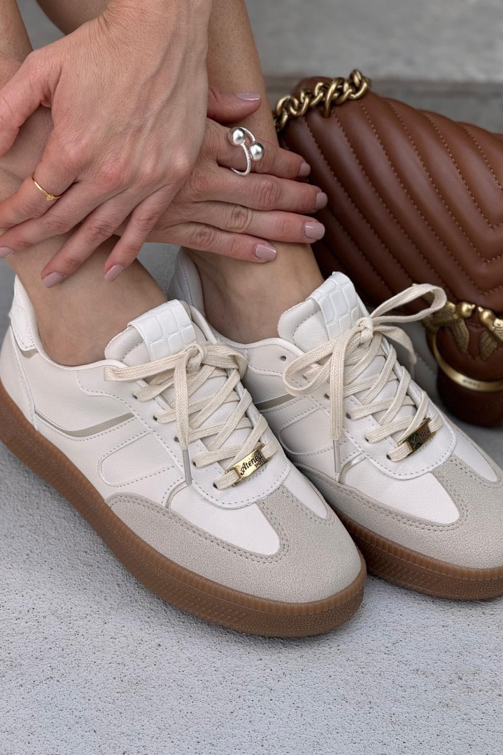 unos tenis en tono beige que refleja elegancia y versatilidad. Su diseño limpio y sofisticado lo convierte en el complemento perfecto para looks casuales con un aire moderno y refinado.