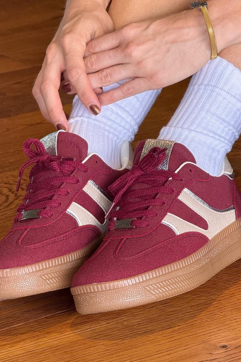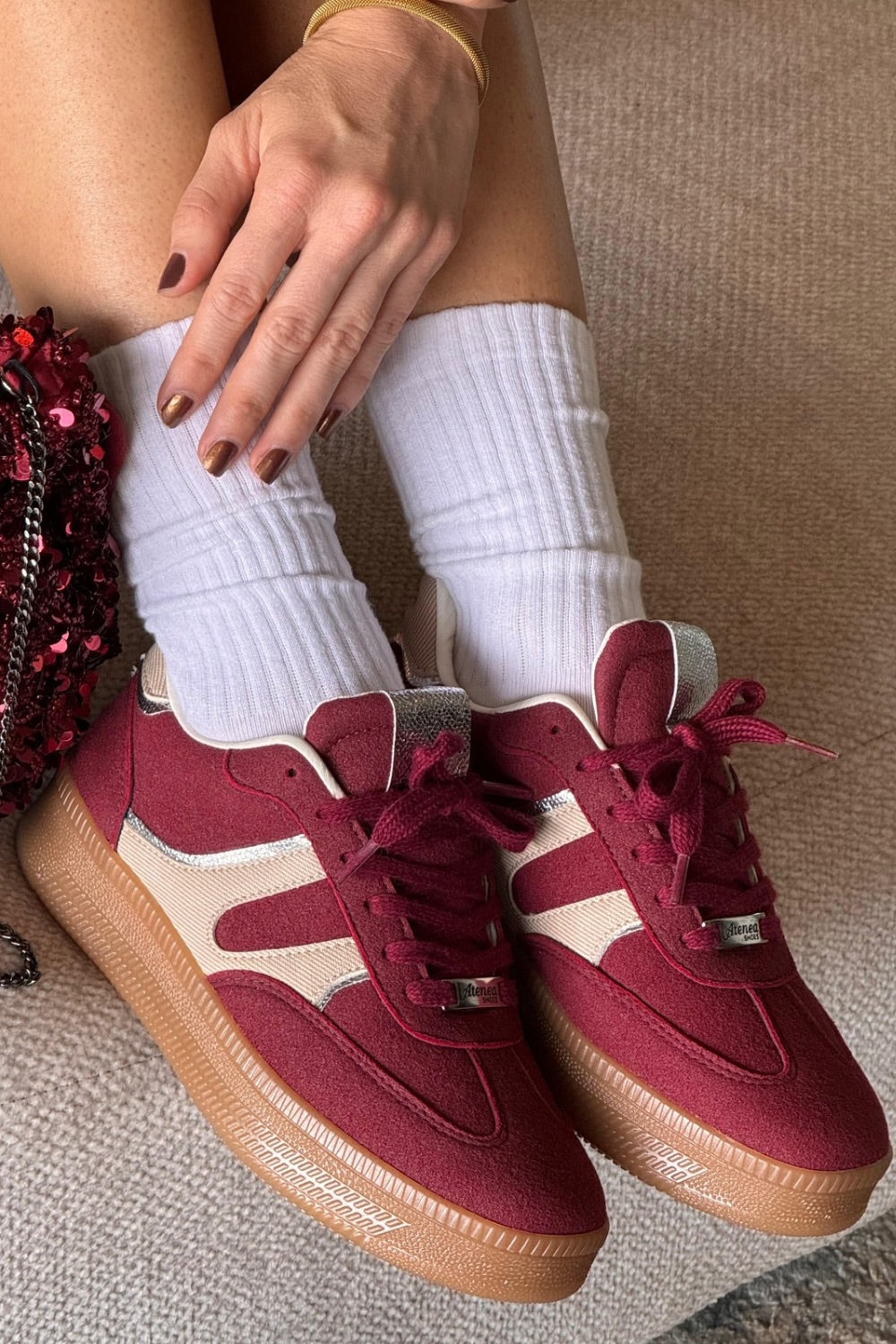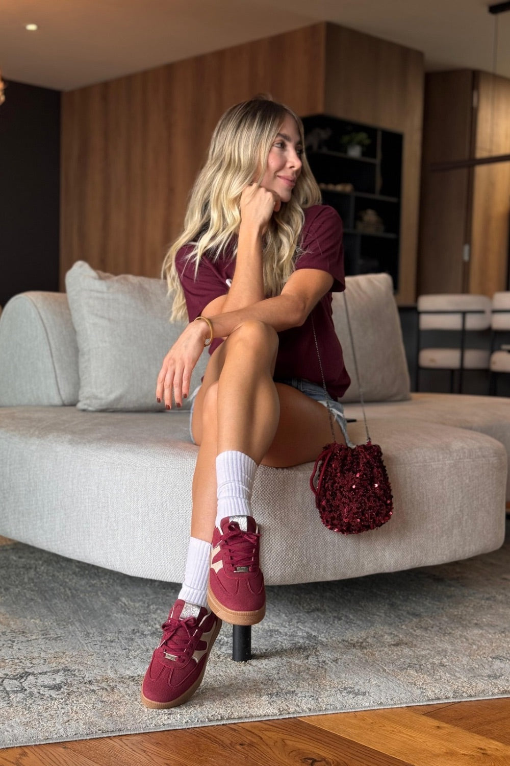 Un diseño sofisticado en tono vinotinto que transmite elegancia y carácter. Ideal para elevar outfits casuales con un toque distintivo y femenino que no pasa desapercibido.