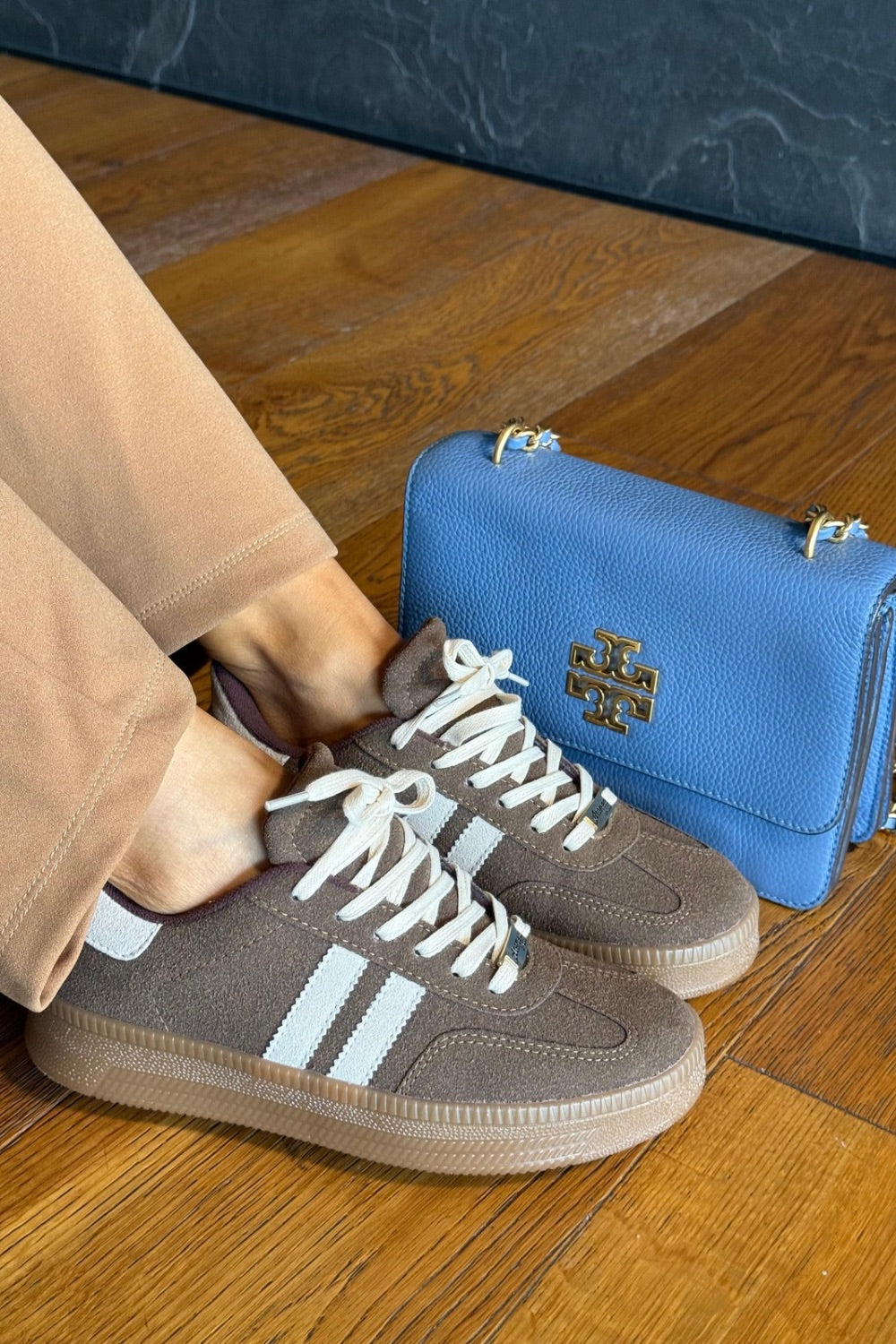 Capellada en material sintético tipo carnaza en tono moka, detalle de dos líneas en color beige que aportan contraste y estilo. Suela de goma de 3 cm. plantilla Confort densidad 60.